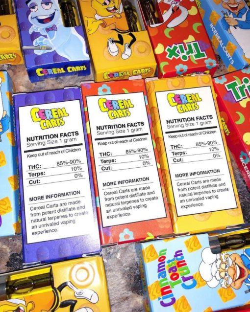 Cereal carts A pre-filled container of cannabis oil or concentrate designed for use with an e-cigarette or vape rig. Vape carts or cartridges are small attachments to a marijuana e-cigarette or vape pen.