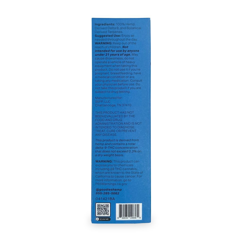 The Goodies Girl Scout Cookies Delta-8-THC Disposable Vape is an Indica dominant hybrid and has a potent earthy aroma paired with sweet floral notes. Consumers have reported feelings of joy and euphoria that often induce creativity. On the flip side, this Indica-dominant strain may land you in-da-couch. This rechargeable vape does not require a separate battery. Each 1 ml disposable Delta-8-THC vape contains approximately 900 mg Delta-8-THC distillate and is made with botanical-derived terpenes.